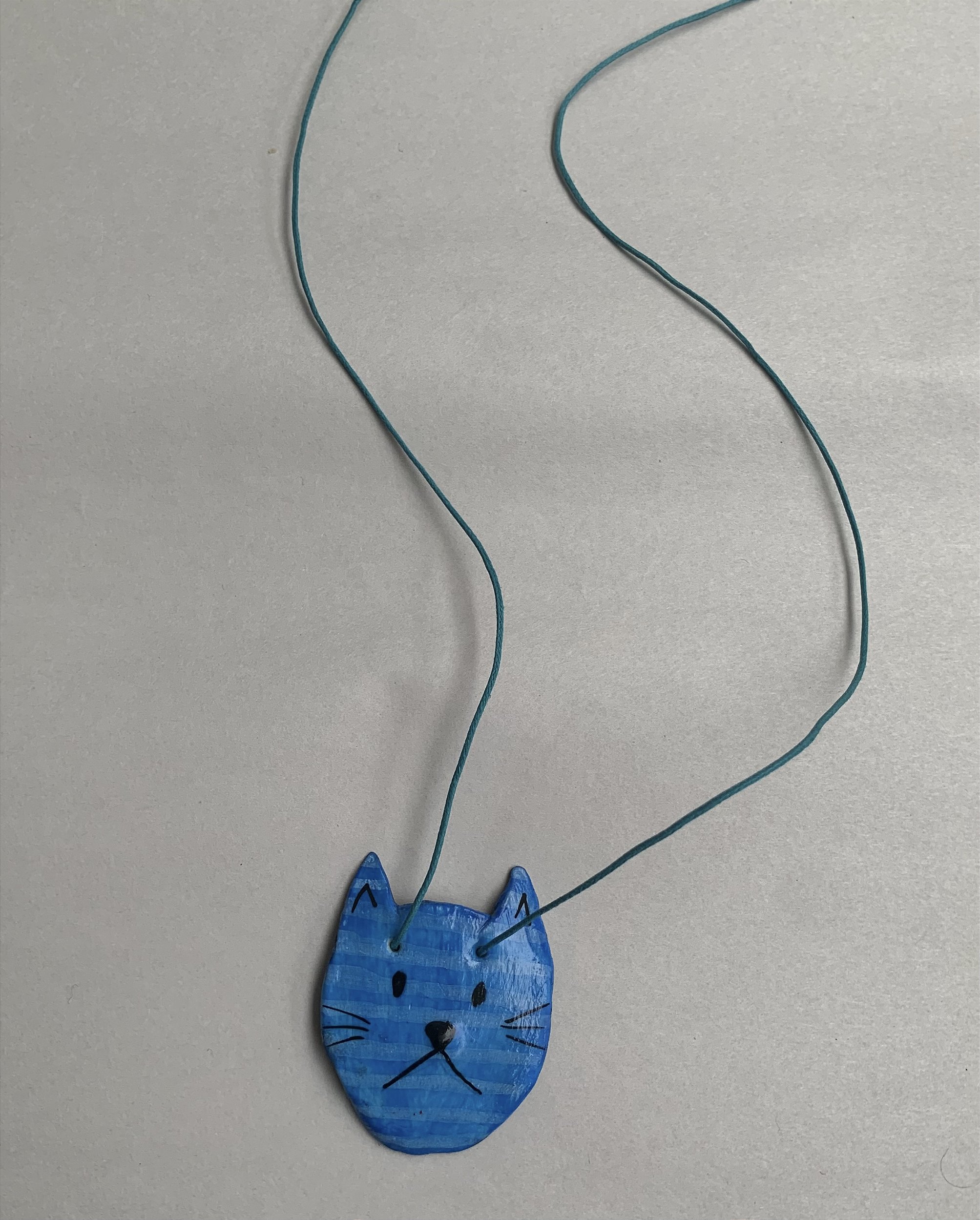 Cordãozinho com pingente de carinha de gato  feito em porcelana plástica manipulada aleatoriamente para criar formatos imperfeitos.