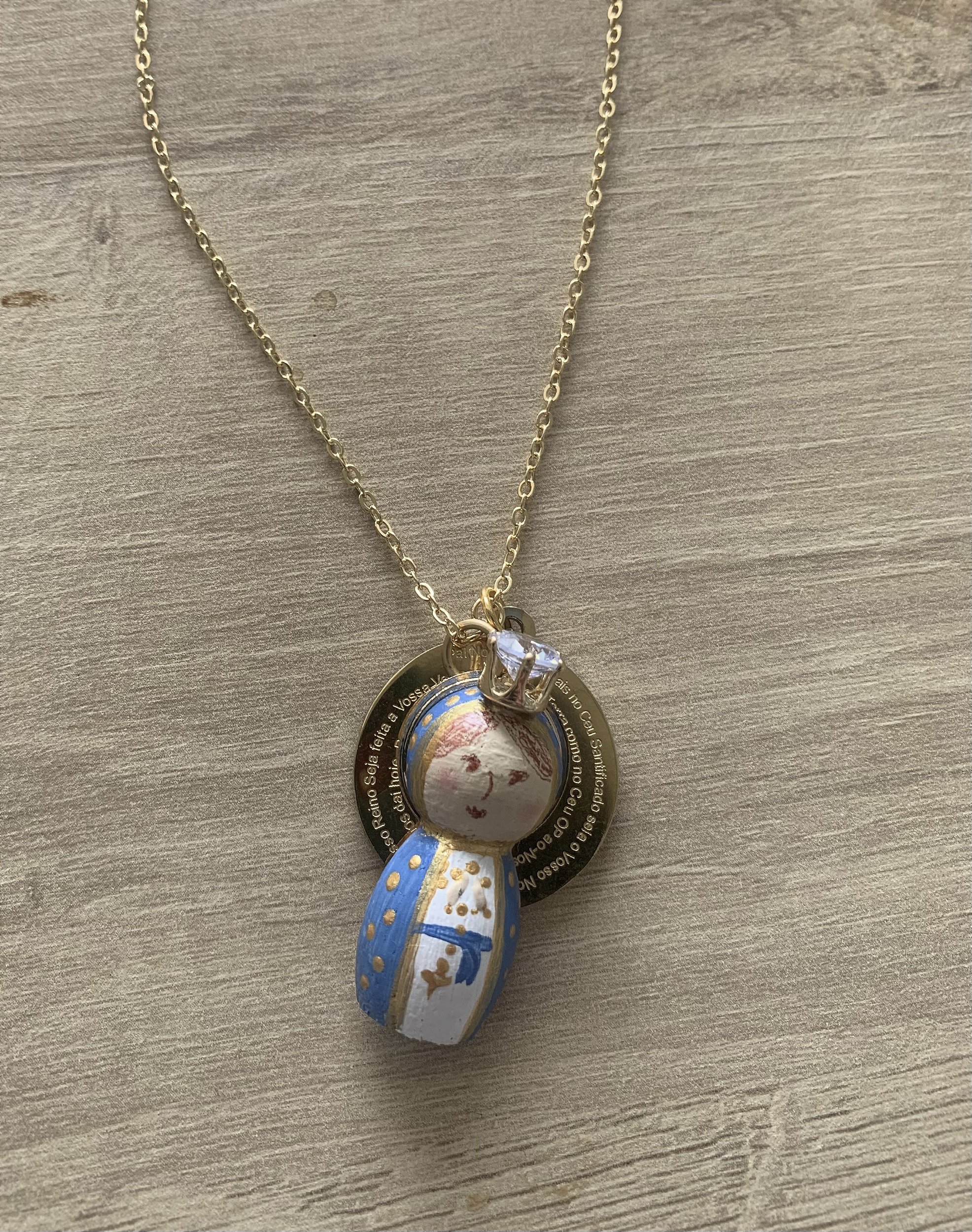 Corrente em aço inoxidável (não escurece, não causa alergias) com pingentes de NS das Graças em madeira pintada à mão e medalha em aço inox com gravação do Pai Nosso.