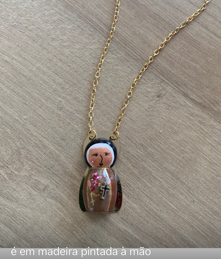 Pingente em madeira pintado à mão com base em aço banho ouro.